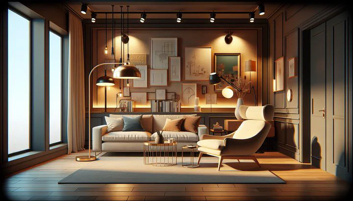 Ambient lighting is like the sun in your living room. It’s the main light that fills the room so you can see everything clearly. Think ceiling lights like chandeliers or recessed lights. These lights help you move around safely and set the base layer of your lighting setup.